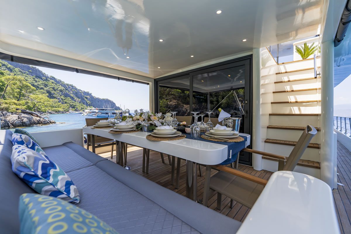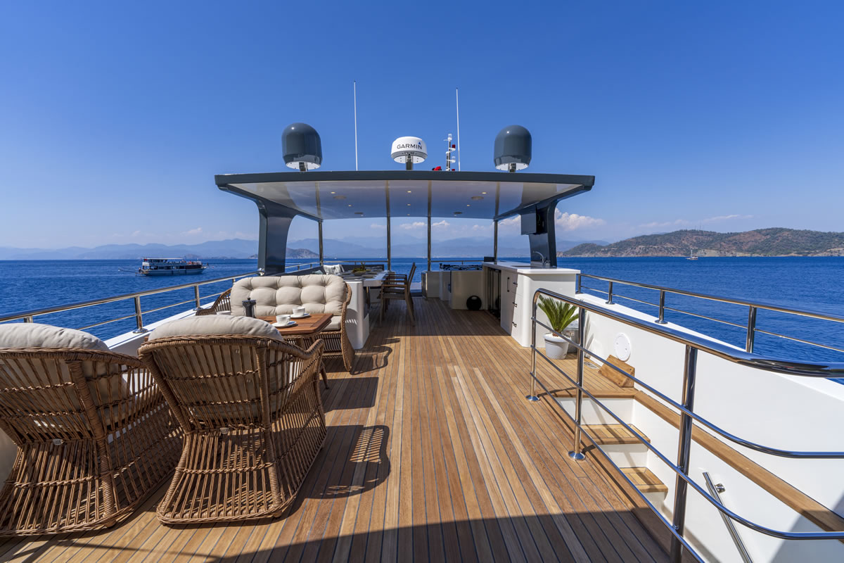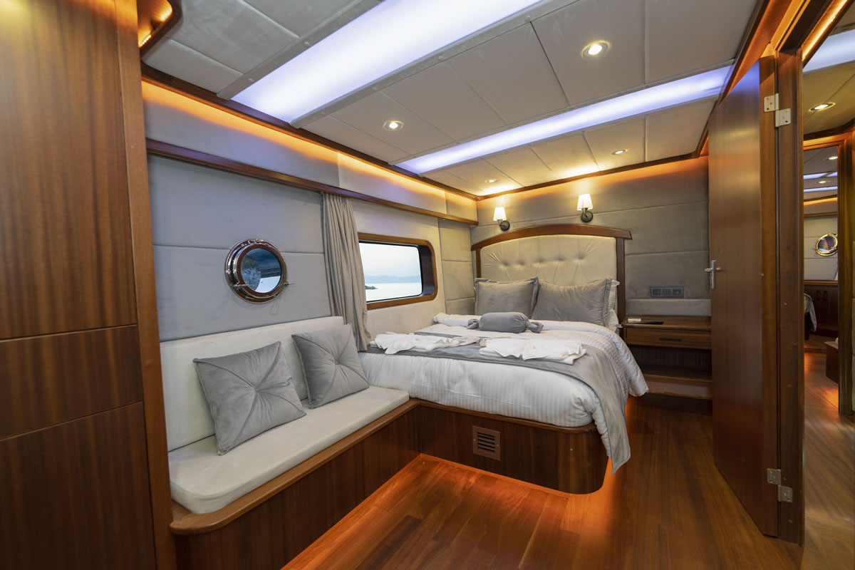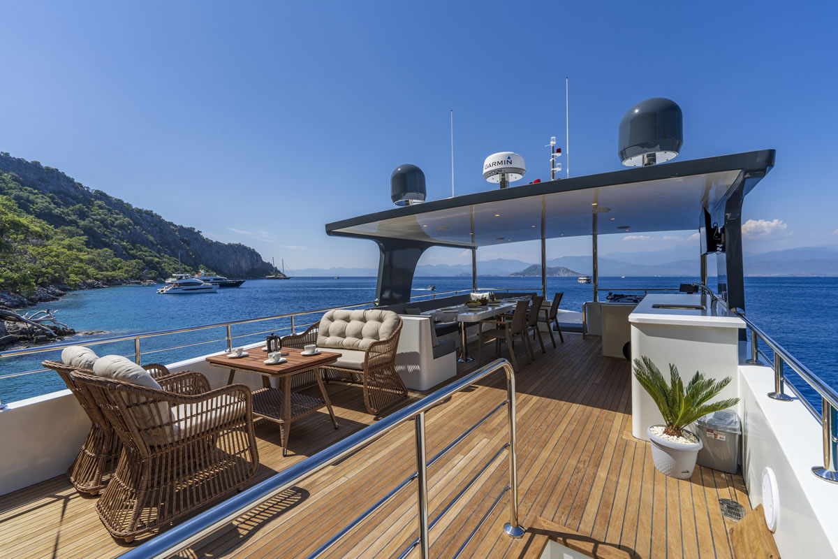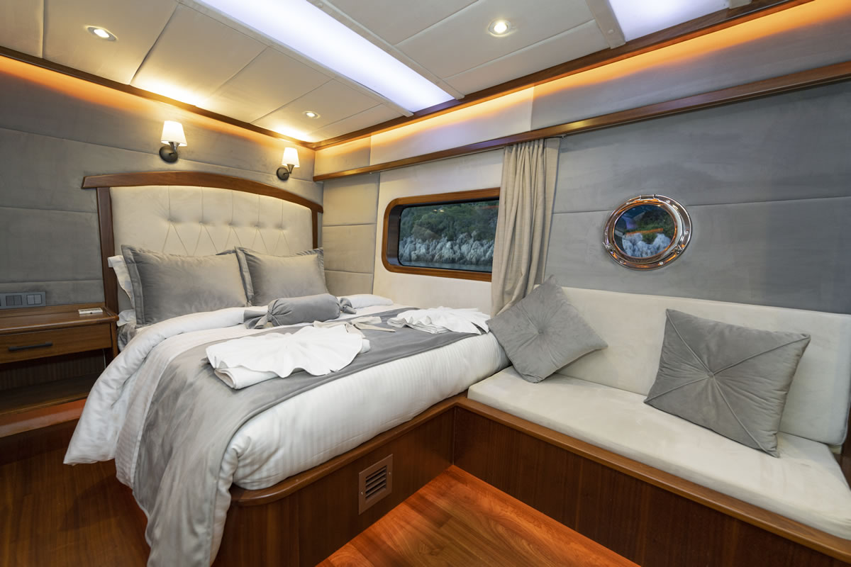 Trawler OGGUSTO is luxurious, comfortable and high quality furniture upholstery; She impresses with its simple and elegant design.This 22-meter-long brand new boat, built in 2023 and has bed capacity of 8 people. One of the 4 cabins from 1 master and 3 doubles, is on the main deck and the others are in the lower deck. Cabins have the comfort to have a peaceful time. Each cabin has a TV, hair dryer, bathroom with shower cabin and WC. In addition to its bar where special drinks are prepared, it offers a wide area to sunbathe or relax in the shade with different styles of seating/resting groups on the upper deck – fly bridge. There are two dining tables, one on the aft deck and the other on the flybridge floor, where 8 people can dine comfortably with magnificent views. We are ready to provide a pleasant blue cruise with a friendly and professional team of 4 people.