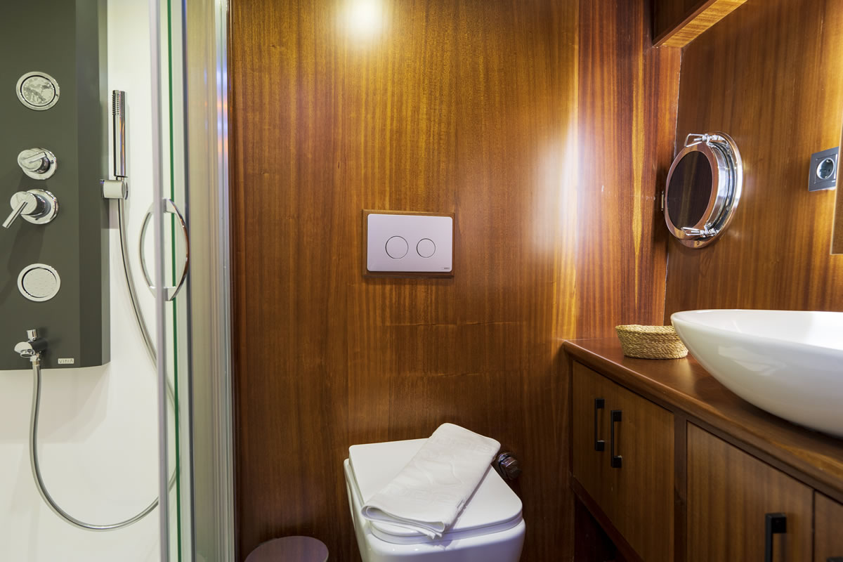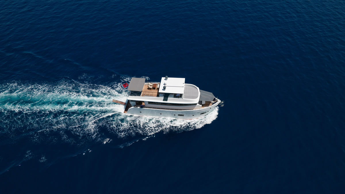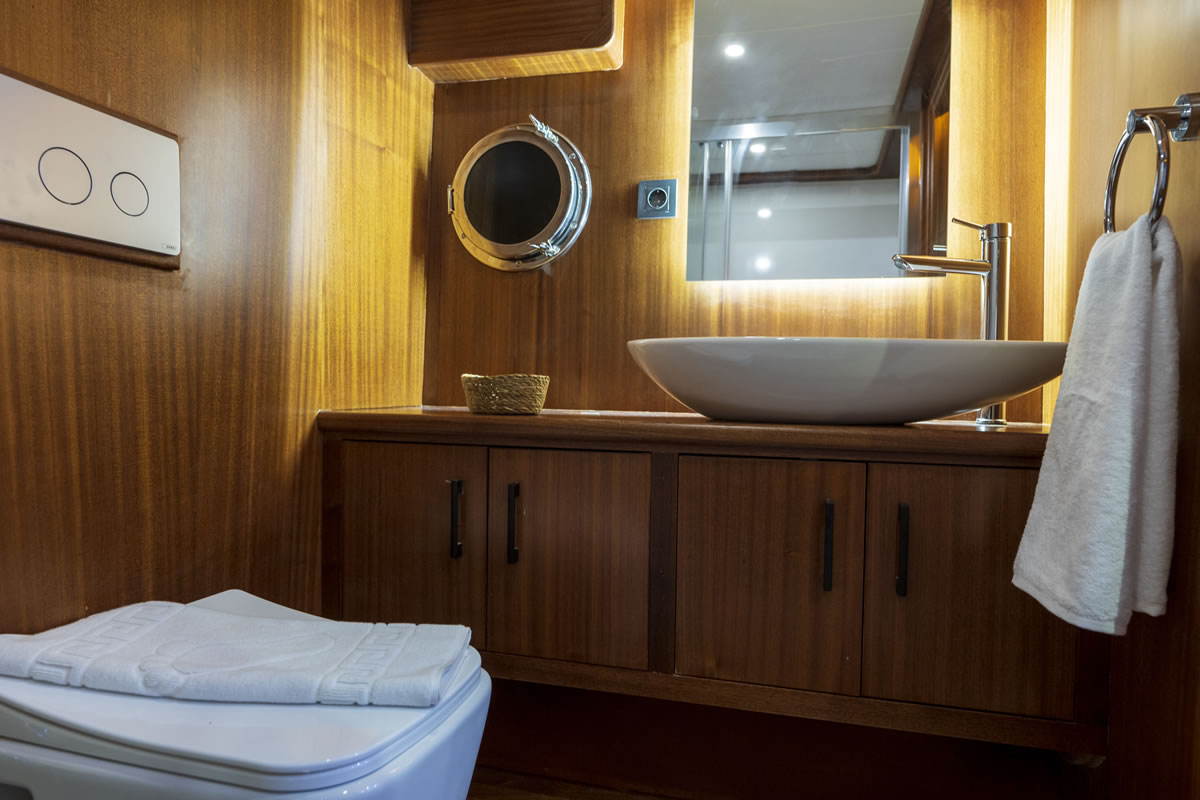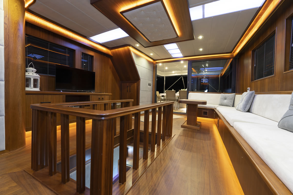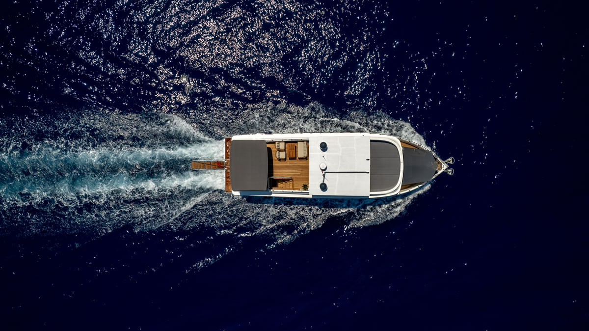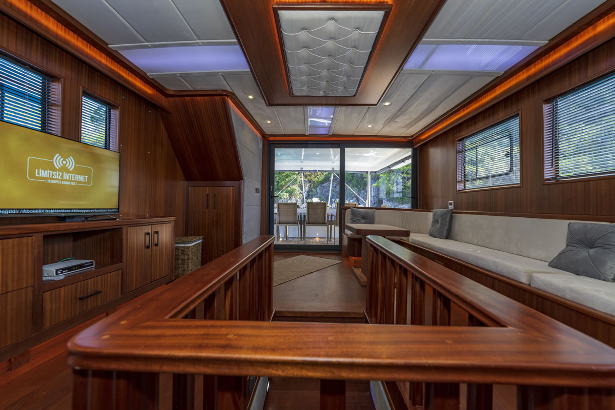 Trawler OGGUSTO is luxurious, comfortable and high quality furniture upholstery; She impresses with its simple and elegant design.This 22-meter-long brand new boat, built in 2023 and has bed capacity of 8 people. One of the 4 cabins from 1 master and 3 doubles, is on the main deck and the others are in the lower deck. Cabins have the comfort to have a peaceful time. Each cabin has a TV, hair dryer, bathroom with shower cabin and WC. In addition to its bar where special drinks are prepared, it offers a wide area to sunbathe or relax in the shade with different styles of seating/resting groups on the upper deck – fly bridge. There are two dining tables, one on the aft deck and the other on the flybridge floor, where 8 people can dine comfortably with magnificent views. We are ready to provide a pleasant blue cruise with a friendly and professional team of 4 people.